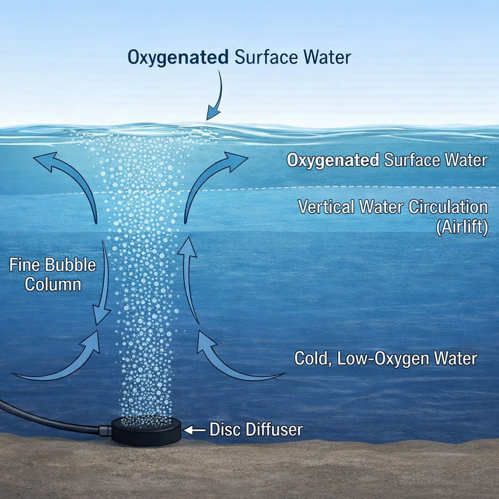 The diffuser releases tiny bubbles that rise to the surface, pulling water up with them. This creates a circulation loop that mixes the entire pond.