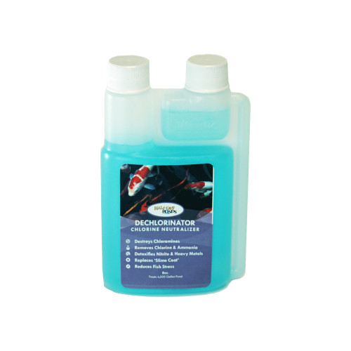 Half Off Ponds Dechlorinator - Chlorine Neutralizer Half Off Ponds Dechlorinator is designed to neutralize chloramine (chlorine and ammonia) and binds harmful and insoluble elements that are common in tap water. Dechlorinator contains natural botanical extracts to help fish adjust through times of increased stress and creates a safe environment for fish and other aquatic life. Dechlorinator makes municipal tap water safe and protects your fish from the dangers of chlorine exposure and heavy metal toxicity in new and established ponds. Half Off Ponds Dechlorinator protects your fish from gill damage and restores their natural slime coat". This product is indispensable for routine or emergency water changes and during times of transit. You should always have a bottle on hand. Safe for fish and aquatic plants. Directions: Apply 1 oz. per 1000 gal. around the edges of the pond and in front of your skimmer, to allow product to mix through the whole system. note: When used to neutralize Chloramines ensure that the pond has established biological filtration, and you follow up with an Half Off Ponds Beneficial Bacteria treatment to optimize surplus nutrient absorption. If high quantities of Chlorine or any Chloramines are present, treatment quantity can be safely increased to double the regular dosage to ensure that all Chlorine is neutralized and that all Chloramine bonds are destroyed. For optimal results: Ensure a pH of 7.2-8. 9 and proper circulation in the pond via pump, fountain, or waterfall; and follow up with routine treatments of Half Off Ponds Beneficial Bacteria. Keep Out of Reach of Children. Store at Room Temperature. For Use in Closed System Ponds Only. Attention: Failure to use as directed may result in loss or injury to aquatic life. Half Off Ponds is not responsible for any loss of aquatic life.
