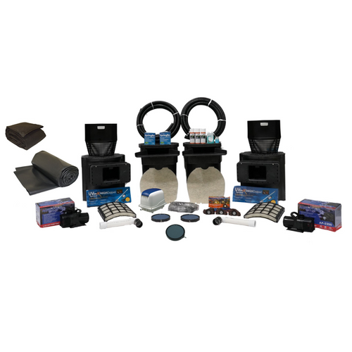 - Everything You Need - Includes: Livingponds 22" Waterfalls (x2), Livingponds Bottom Drain Kits (x2), Standard Skimmerfilters w/ 16" Weir Assemblies (x2), 55-Watt HO UVinex Systems (x2), 2.8 CFM Aeration Kit, Aqua Pulse 5,200 GPH Pumps (x2), 30 ft. x 35 ft. of 45-mil EPDM LifeGuard Pond Liner, 1,050 sqft. of UnderGuard Geotextile Underlayment, (2) 2 in. x 50 ft. PVC Pipe, LED Rock Light Set, (3) 16oz. can of Foam, and all necessary plumbing fittings.